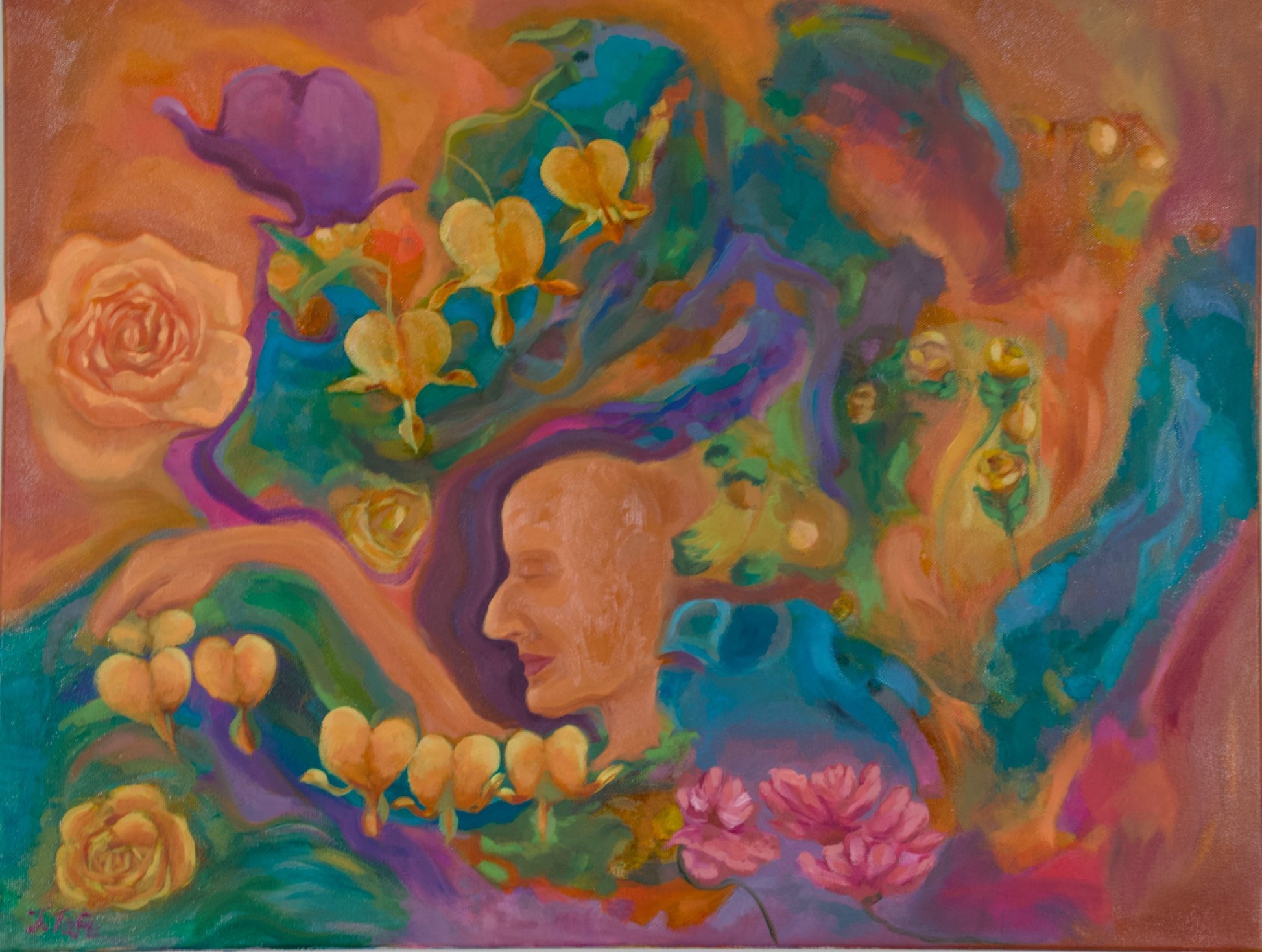 A profile emerges through layered bleeding heart florals and expressive colour fields, woven into the landscape rather than separated from it. This original oil painting reflects the quiet power of being fully oneself - unarmoured, grounded, and at ease.